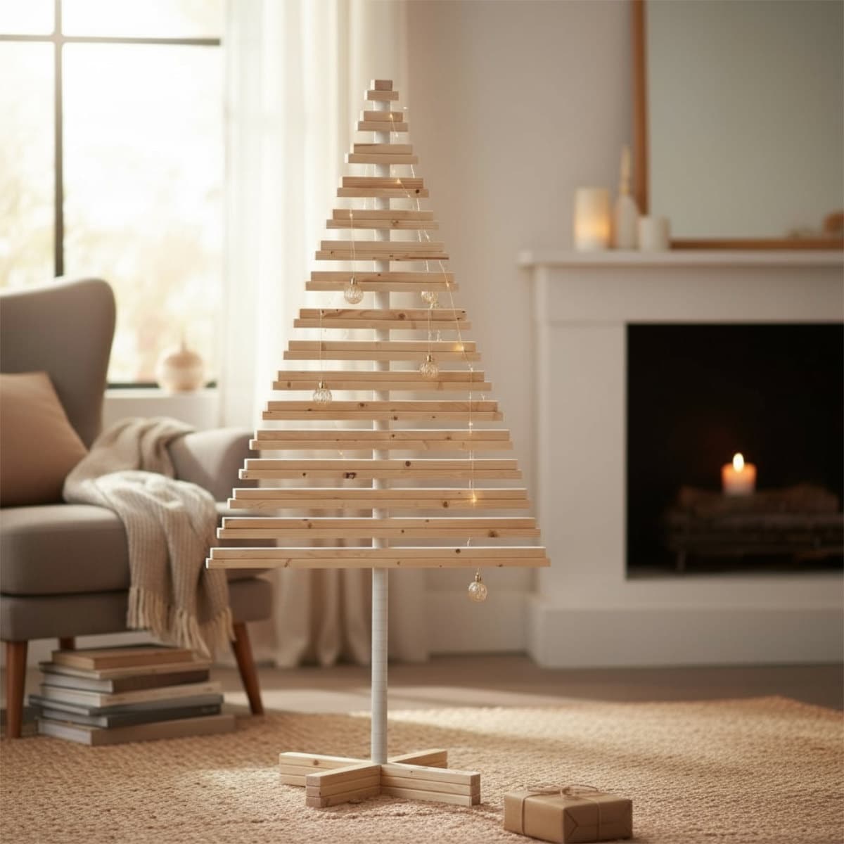 - Lichterkette spiralförmig legen: Am besten von oben nach unten, locker zwischen die Latten gelegt oder leicht um den Stamm gewickelt. Warmweißes Licht passt optisch besonders gut zum Fichtenholz.