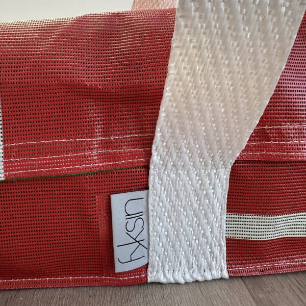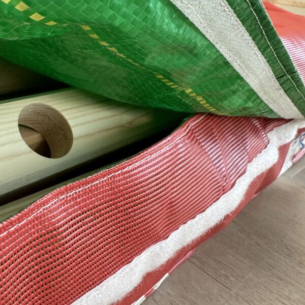 Bei jeder Tasche handelt es sich um ein absolutes Unikat und konkrete Farben und Muster können nicht garantiert werden. Jede Tasche wurde von Hand genäht und besteht aus 2 Lagen. Die äußere Lage ist ein Netzmaterial, welches aus ehemaligen Bannern und Werbepostern besteht. Die innere Lage besteht aus einem wasserfesten Material, welches die Bäume vor Feuchtigkeit schützt. Dieses Material könnte zum Beispiel aus Säcken bestehen, in denen einmal Bio-Zucker transportiert wurde und die normalerweise nach einmaligem Gebrauch vernichtet werden müssten. Durch das upcycling und die Umwandlung in unsere Taschen, erhält das Material einen neuen Zweck, und kann so für viele Jahre genutzt werden.